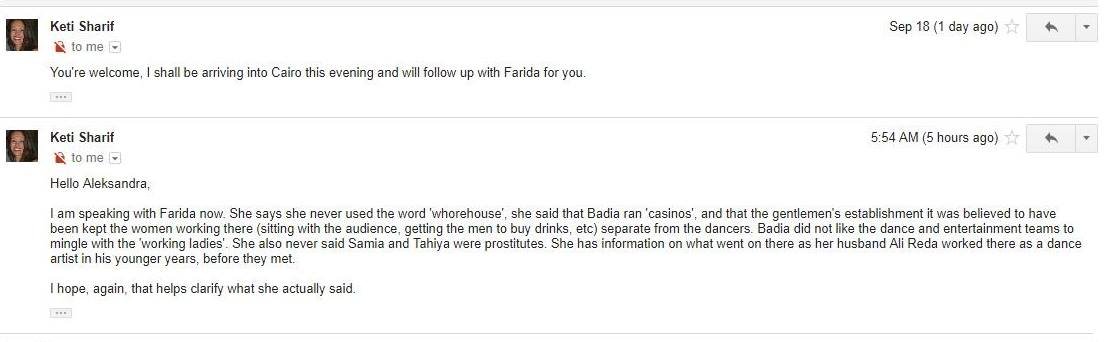 El is szomorodtam és megbántódtam, amikor ezt olvastam, ezért elhatároztam egyik este, hogy emailt küldök Farida Fahmy-nak, hogy őt magát kérdezzem meg ezekről a pletykákról. Kedves asszisztense, Kety Sharif válaszolt nekem és azt írta, beszélni fog Faridával a témáról és email fordultával választ küld nekem.
